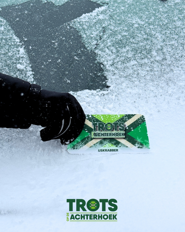 IJs, machtig mooi om op te schaatsen of om te eten in een ijszaak, maor niet wanneer je moet krabben. Maar daar heeft Trots op de Achterhoek een oplossing voor, de Achterhoekse vlag ijskrabber. Met deze ijskrabber glijdt het ijs zo van ow ruiten af. Terwijl je an 't krabben bent zie je onze prachtige Achterhoekse vlag. Zoals je ziet liggen er al wat sneeuwvlökskes op de krabber, zo kom i-j toch al een bietje in winterse sferen.